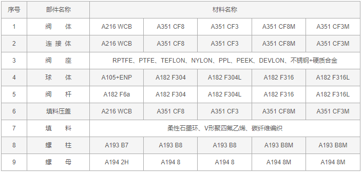 美標氣動球閥零件材料: